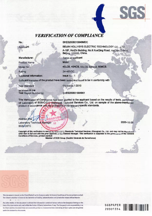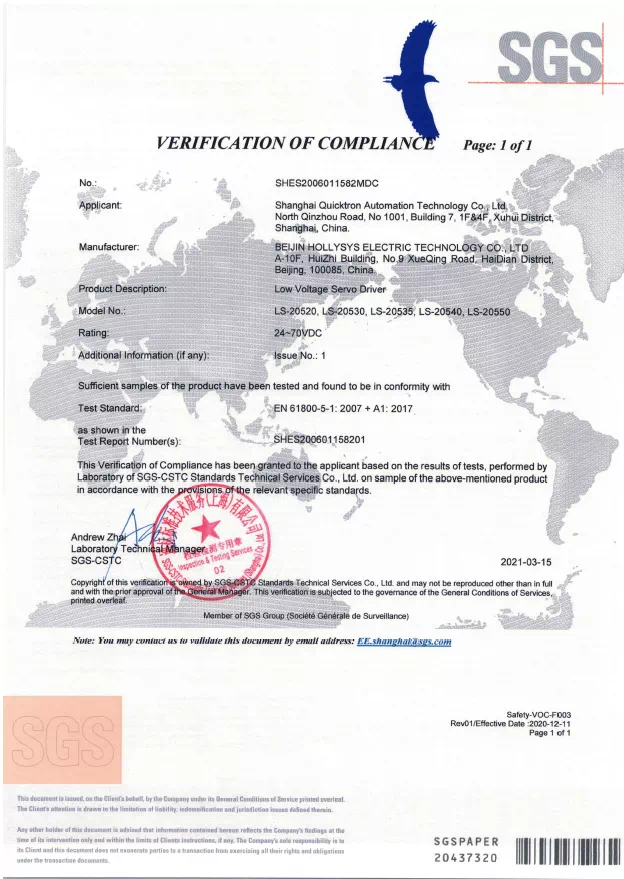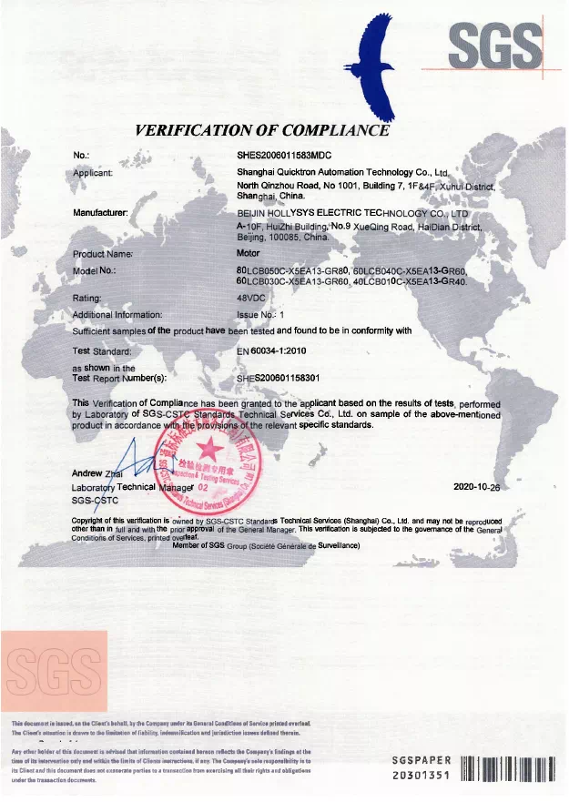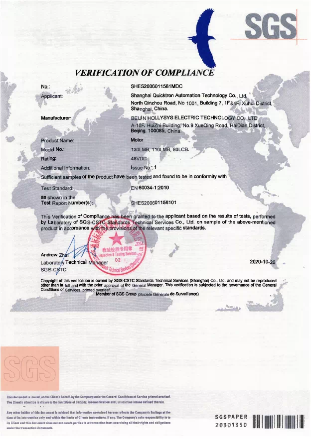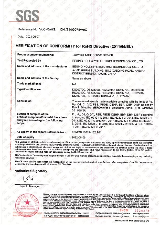 SGS是全球領先的檢驗、鑒定、測試和認證機構(gòu),是全球公認的質(zhì)量和誠信基準。SGS作為國際權(quán)威認證機構(gòu)為和利時電機產(chǎn)品頒發(fā)CE證書和RoHS證書,是對和利時電機技術(shù)實力的專業(yè)背書,增強了和利時電機產(chǎn)品在國際市場的品牌力,也助力設備制造商加速全球化步伐。
