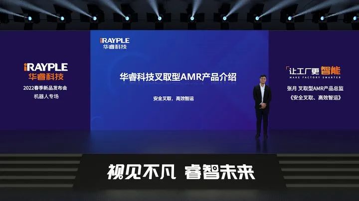 華睿科技叉取型AMR產品總監張月在本次發布會上帶來了“安全叉取,高效智運”為主題的新產品介紹。他表示“隨著叉車無人化率的不斷提升,托盤和物料的無人化轉運場景越來越多樣化。為了更好的適應場景多樣化,提高倉庫容積率和運行安全。全新推出的窄通道堆高式叉取AMR,在取貨通道,安全防護,智能感知等方面全面升級。成熟應用于鋰電、包裝、3C等行業的物料搬運及堆高場景。在安全性,穩定性,高效率等方面得到了多場景的驗證。”