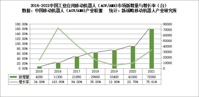 圖表:2015-2021中國市場(chǎng)企業(yè)工業(yè)應(yīng)用移動(dòng)機(jī)器人(AGV/AMR)新增量(臺(tái))與增長率