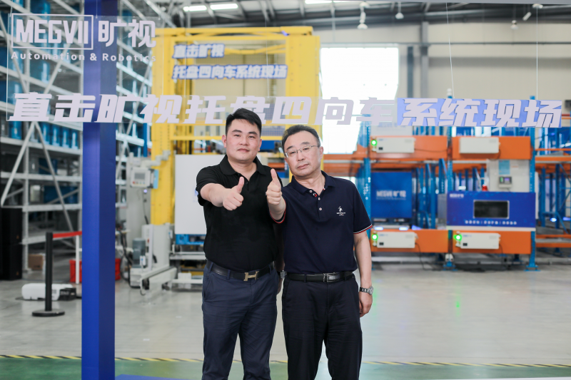 紫宸科技溧陽(yáng)公司總經(jīng)理南明哲(右)與曠視物流業(yè)務(wù)事業(yè)部產(chǎn)品業(yè)務(wù)負(fù)責(zé)人程昌順(左)在曠視四向車(chē)系統(tǒng)直播現(xiàn)場(chǎng)