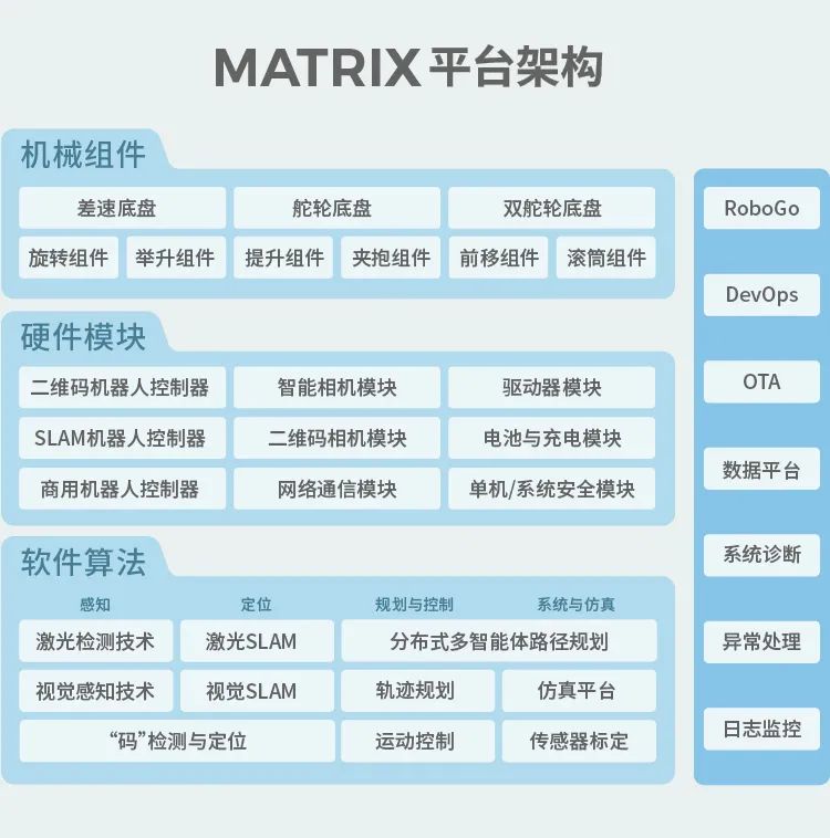 MATRIX,譯作“矩陣”,常見于應(yīng)用數(shù)學(xué)、計算機(jī)、物理等學(xué)科,是機(jī)器人的AI核心技術(shù)支撐。如果把極智嘉機(jī)器人產(chǎn)品比作枝葉和果實,那么MATRIX平臺就如同樹干,就是極智嘉全產(chǎn)品矩陣的發(fā)展根基。