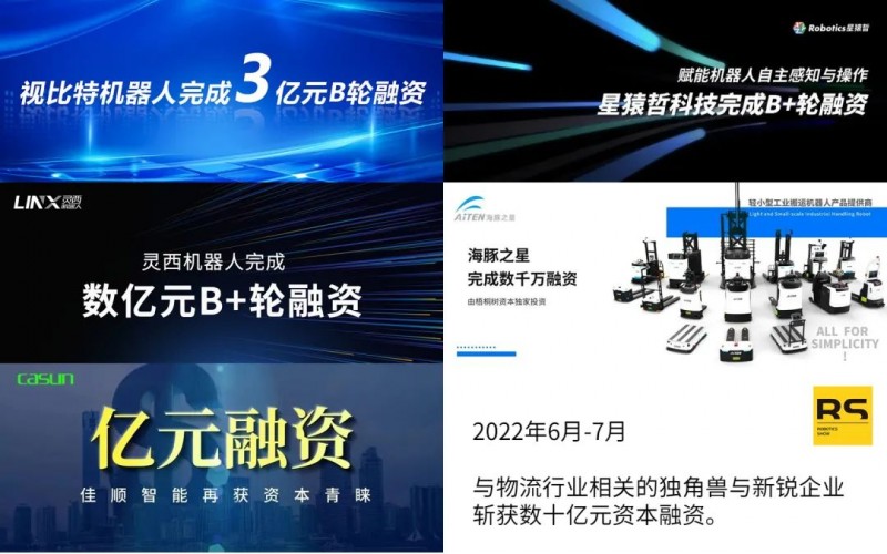 敏銳的資本最先觀察到這波新的移動機器人(AGV/AMR)與物流相關(guān)機器人爆發(fā)苗頭。據(jù)不完全統(tǒng)計,就2022年6月與7月間,與物流行業(yè)相關(guān)的獨角獸與新銳企業(yè)斬獲數(shù)十億元資本融資:視比特(展位號:8.1H C198)完成3億元B輪融資,星猿哲科技(展位號:7.1H E230)完成融資金額約4000萬美元的B+輪融資,靈西機器人(展位號:8.1H C062)完成數(shù)億元B+輪融資,佳順智能(展位號:7.1H D125)再獲近億元人民幣的融資,海豚之星(展位號:7.1H E175)宣布完成數(shù)千萬元融資......均是千萬級以上投資。