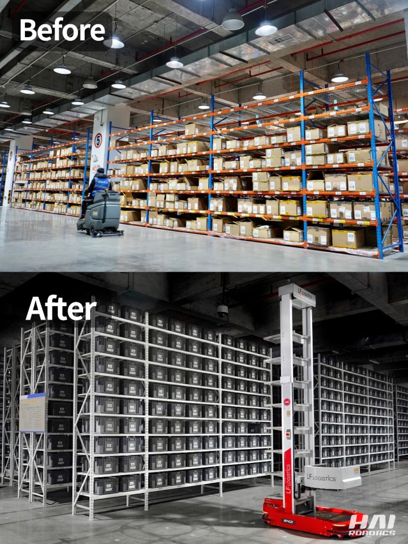 針對利豐供應(yīng)鏈倉庫存儲密度低,存儲壓力大的痛點(diǎn),海柔創(chuàng)新部署HAIPICK A42箱式倉儲機(jī)器人搭配立體貨架的組合存儲方式,其中立體貨架高度可高達(dá)4.3米。此外,由于ACR的產(chǎn)品設(shè)計理念是貨箱到人,對比潛伏式移動機(jī)器人機(jī)身設(shè)計更窄,使得貨架之間的巷道面積得以進(jìn)一步縮小,從而提升存儲密度。改造后的前海