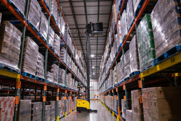 第一臺無人叉車采用配備 JBT 自動化系統機器人技術的 Crown R 1000 系列雙深位前移式叉車。