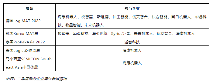 二季度,海外比較受關注的展會如德國LogiMAT 2022及韓國Korea MAT展都吸引了不少國內企業的參與,如海康機器人、極智嘉、斯坦德、仙工智能、優艾智合、快倉智能、國自機器人、華睿科技、牧星智能等,都攜旗下代表性產品及方案一一亮相。