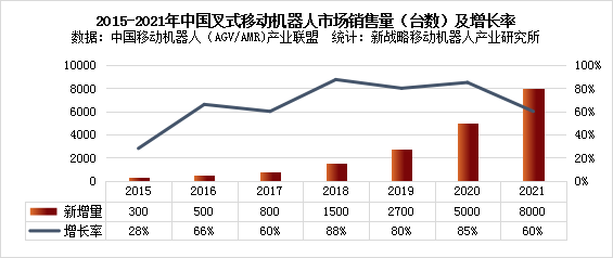 圖表:2015-2021年中國叉式移動機器人市場銷售量(臺數(shù))及增長率