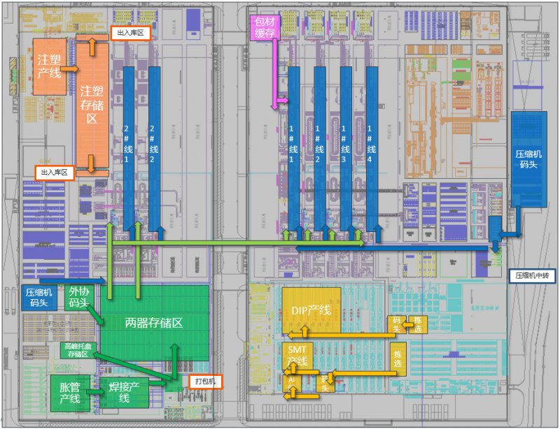 實(shí)現(xiàn)二器、注塑、電子、組裝等多個區(qū)域AMR自動化轉(zhuǎn)運(yùn),實(shí)現(xiàn)柔性、跨多區(qū)域靈活、智能轉(zhuǎn)運(yùn);