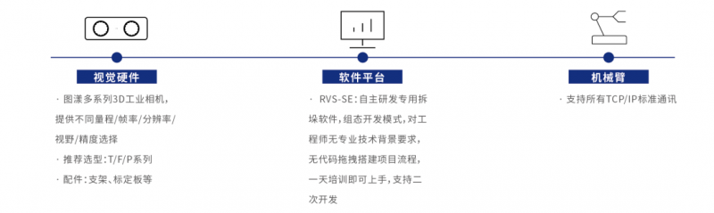 圖漾3D視覺引導(dǎo)軟包拆垛方案主要由圖漾核心自主專利的3D工業(yè)相機(jī)、深度學(xué)習(xí)算法及RVS-SE軟件、機(jī)械臂(可選)、工業(yè)PC等共同構(gòu)成。