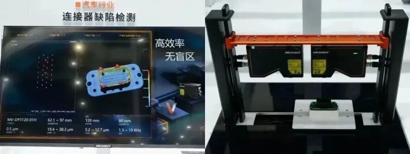 汽車連接器通常存在缺針、多針、斷針、偏位等問題。我司采用兩臺DP3120相機進行針腳成像,雙相機對頭拼接方法可有效消除由于連接器塑料殼邊沿形成的視野盲區,全面提升成像視野范圍。DP3000系列相機內置的抗反光干擾算法可以優化針腳的成像效果,在處理針腳排列問題上,VM 3D算法開發平臺特別推出了一種專用算子技術,顯著地降低了檢測方案搭建的難度,幫助客戶快速輸出檢查結果。