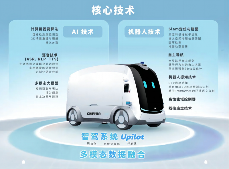 據(jù)了解,Chitu赤兔還搭載了UQI優(yōu)奇自主研發(fā)的智能駕駛系統(tǒng)Upilot,并融合計算機(jī)視覺算法、語音技術(shù)、多模態(tài)大模型、SLAM定位與建圖、自主導(dǎo)航、高精度感知等“AI+機(jī)器人”技術(shù),達(dá)到國內(nèi)先進(jìn)的L4級無人駕駛技術(shù)水平。
