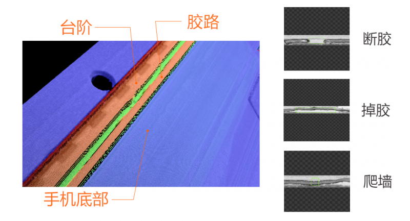 在消費類電子產品和汽車汽配等行業的生產工藝中,涂膠質量直接影響到產品的使用壽命和安全性,而傳統的2D視覺無法對涂膠高度進行檢測。因此,引入3D視覺來彌補這一短板,不僅能夠基于多個工藝標準對涂膠質量進行檢測,更能夠為企業提供可靠的質量管控保障。