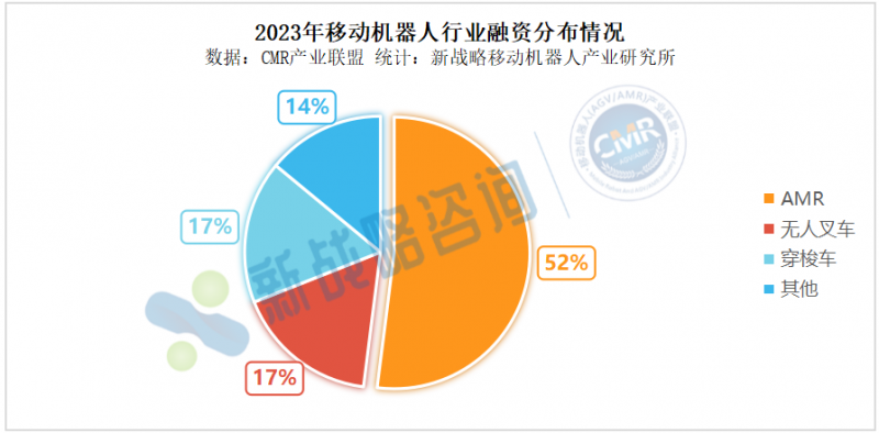 從融資分布看,以AMR為核心產(chǎn)品的企業(yè)最受資本青睞,占比超過50%。其次,以無人叉車、四向穿梭車為主打產(chǎn)品的企業(yè)也是資本關(guān)注的重點,這些產(chǎn)品也是2023年行業(yè)熱門產(chǎn)品。