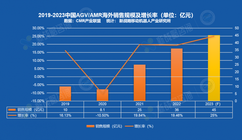 圖表:2019-2023中國AGV/AMR海外銷售規(guī)模及增長率