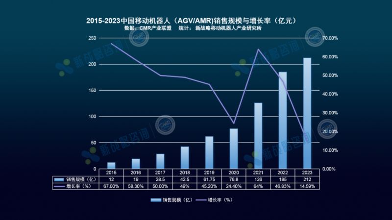 根據CMR產業聯盟數據,新戰略移動機器人產業研究所統計,從2015年至2023年,中國市場移動機器人(AGV/AMR)產業年復合增長率達43.18% ;2023年中國移動機器人(AGV/AMR)銷售規模約為212億,同比增長14.59%;銷售數量約為125000臺,同比增長34.41%。