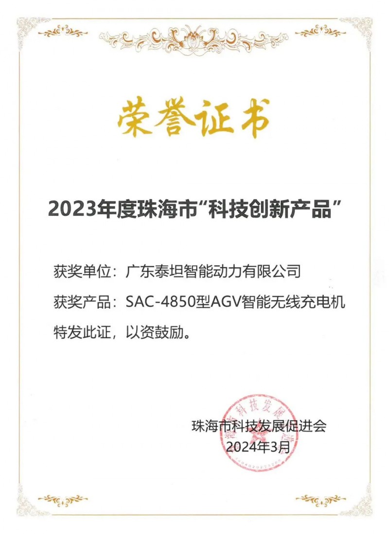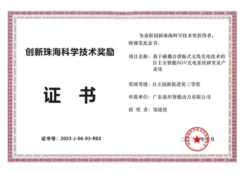 3月29日下午,“創(chuàng)新珠海”科技獎暨科技創(chuàng)新評優(yōu)頒獎典禮在珠海舉行。來自市科技創(chuàng)新局、市工業(yè)和信息化局、市民政局、市科協(xié)等有關部門負責人,企業(yè)、高校、科研院所和社會組織代表共計200余人參會。廣東泰坦智能動力有限公司憑借其基于磁耦合諧振式無線充電技術的自主全智能AGV充電系統(tǒng)研發(fā)及產業(yè)化項目獲得了2023年度珠海科學技術獎-自主創(chuàng)新促進獎三等獎以及2023年度珠海市科技創(chuàng)新產品獎。