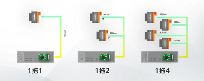 海康機器人推出了不同XoFlink接口數量的配套采集卡,搭配相機自身支持的1link和2link兩種工作模式,可支持1拖1、1拖2、1拖4等多種連接方式,安裝便捷??蛻艨筛鶕π蓄l及整套方案的架設需求靈活選擇拓撲連接模式。