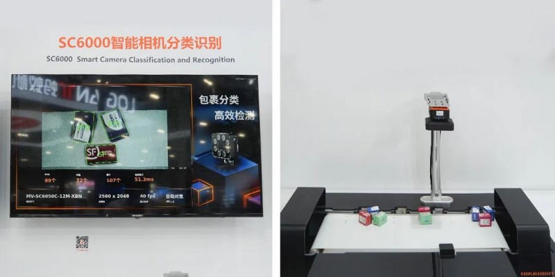 該相機(jī)采用高性能AI嵌入式平臺(tái)開(kāi)發(fā),內(nèi)置VM算法開(kāi)發(fā)平臺(tái),多種通訊協(xié)議,場(chǎng)景適應(yīng)能力強(qiáng)。現(xiàn)場(chǎng)展示的是SC6000對(duì)流通行業(yè)快遞包裹進(jìn)行分類(lèi)識(shí)別,可準(zhǔn)確對(duì)傳送帶上不同類(lèi)別包裹進(jìn)行準(zhǔn)確定位和類(lèi)別分類(lèi)。