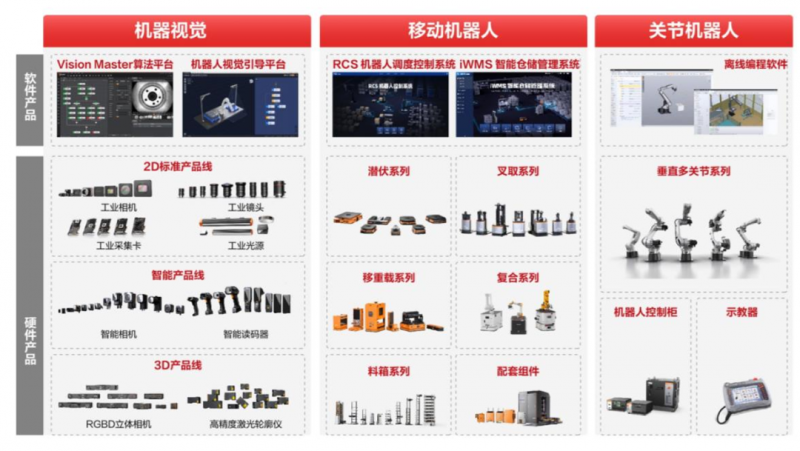 海康機器人于2016年正式成立,業務主要分為三大板塊:機器視覺、移動機器人、關節機器人。