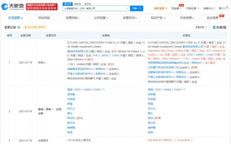 天眼查App顯示,近日,倉儲物流自動化解決方案服務商“Syrius炬星”關聯公司大揚智能科技(北京)有限公司發生多項工商變更,注冊資本增至約205.9萬人民幣,增幅超19.42%;股東新增字節跳動關聯公司北京量子躍動科技有限公司等。