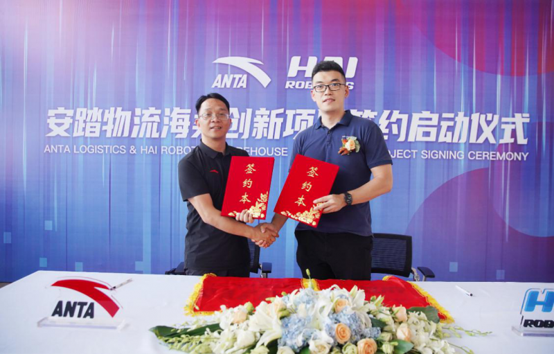 海柔創新創始人及CEO陳宇奇(右)、安踏集團物流總經理(左)出席簽約儀式