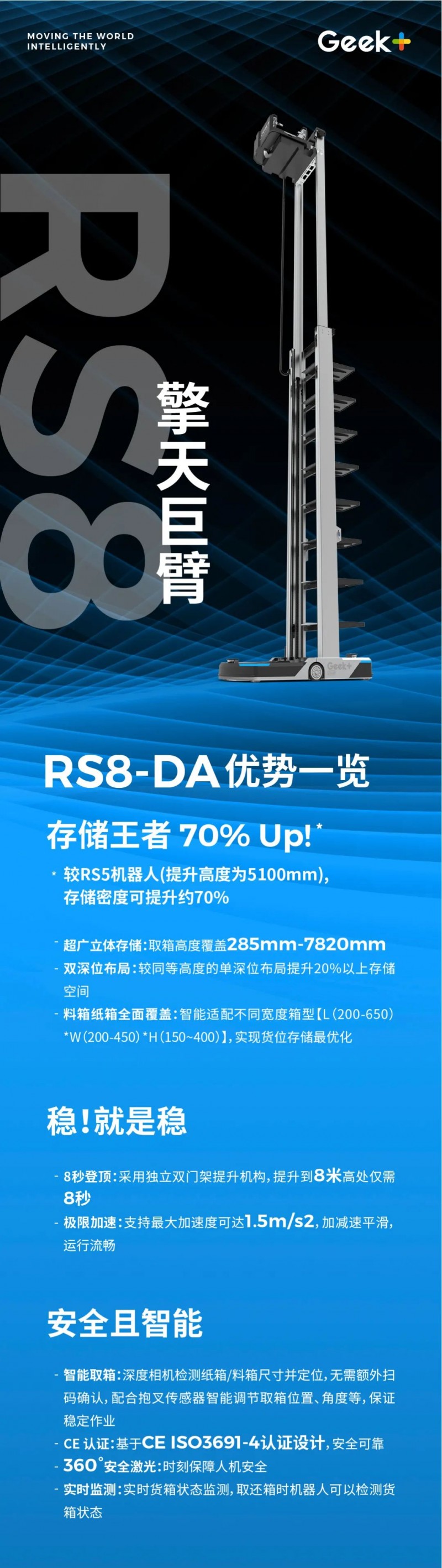 目前,使用傳統人工倉的服裝企業行業所使用的傳統人工倉所來說,廠商面臨的不僅對存儲密度、揀選效率和人員管理有著較高要求,同時還需要解決人工揀選難度大、顆粒度管理較粗及揀選復核人效低等痛點。此次最新推出的RS8貨箱機器人正是助力服裝行業解決以上痛點的機器人存揀利器。