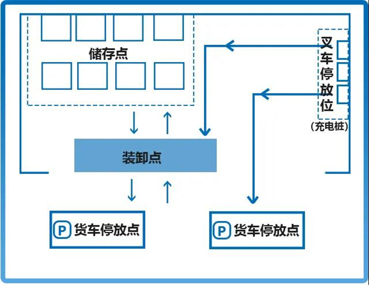 3、AGV叉車(chē)在停車(chē)點(diǎn)自動(dòng)裝卸貨物至卸車(chē)點(diǎn)