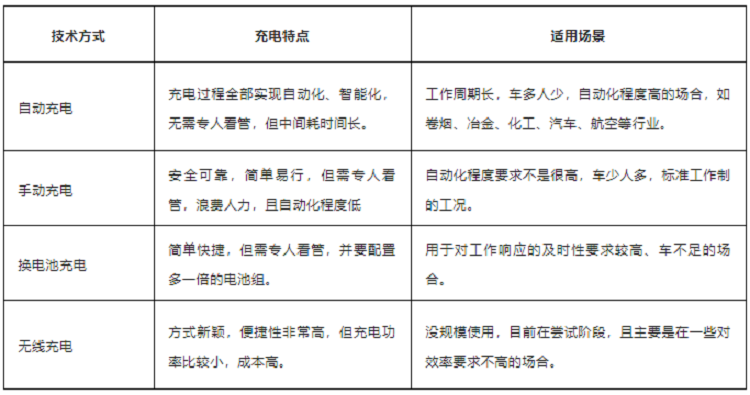 如圖所示,上述四種充電方式中以自動充電的方式最為成熟和高效,因此,自動充電也成為絕大部分移動機器人廠商使用的方案。不過,美中不足的是,自動充電方式耗時較長,機器人在電量不足的情況下,需要離開產線工位到達充電站進行自我充電操作,時間在一到兩個小時不等。另外,在機器人數量較多的情況下, 生產車間還需配置足夠多的充電樁,這對工廠空間利用率而言也是一種浪費。