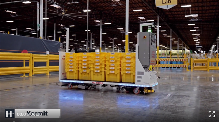 Kermit 相比于 Scooter 體型更小,會(huì)跟隨地面特制的布線運(yùn)行,來運(yùn)送儲(chǔ)物筐。亞馬遜表示,今年至少將會(huì)在北美的十幾個(gè)站點(diǎn)部署 Kermit,同時(shí)也將嘗試著對(duì) Scooter 進(jìn)行極少量的部署運(yùn)作。