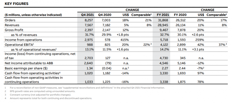 近期,ABB發(fā)布了2021年第四季度及全年業(yè)績(jī),具體情況如下: