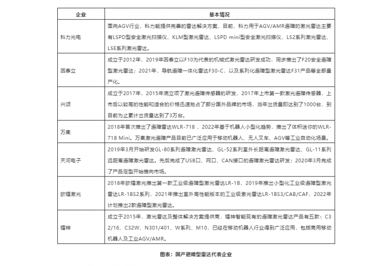 早期國內(nèi)AGV/AMR行業(yè),無論是避障型還是導(dǎo)航型雷達(dá)都以外資品牌應(yīng)用為主,但從2015年左右開始,伴隨著整個(gè)國內(nèi)AGV產(chǎn)業(yè)的發(fā)展,國產(chǎn)激光雷達(dá)也迎來了發(fā)展機(jī)遇期,出現(xiàn)了一批代表企業(yè),尤其是在避障型雷達(dá)方面,在這些激光雷達(dá)廠商的努力下,已經(jīng)基本實(shí)現(xiàn)了國產(chǎn)化,取得了重大的突破。