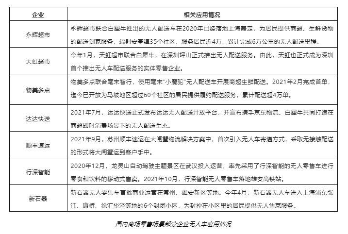而商超配送方面,由于線下市場(chǎng)仍是主力,目前多以合作探索為主。如白犀牛與永輝超市、天虹超市,毫末智行與物美多點(diǎn)等,這些企業(yè)已經(jīng)在部分地區(qū)實(shí)現(xiàn)了常態(tài)化運(yùn)營(yíng)。